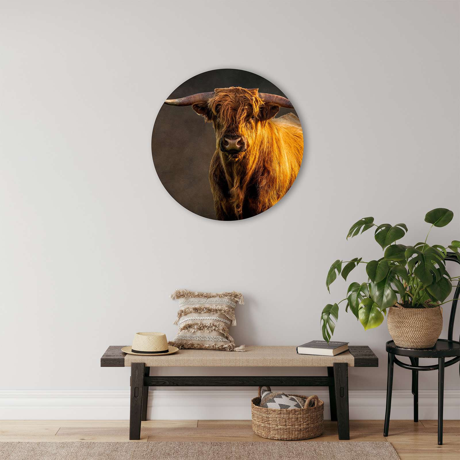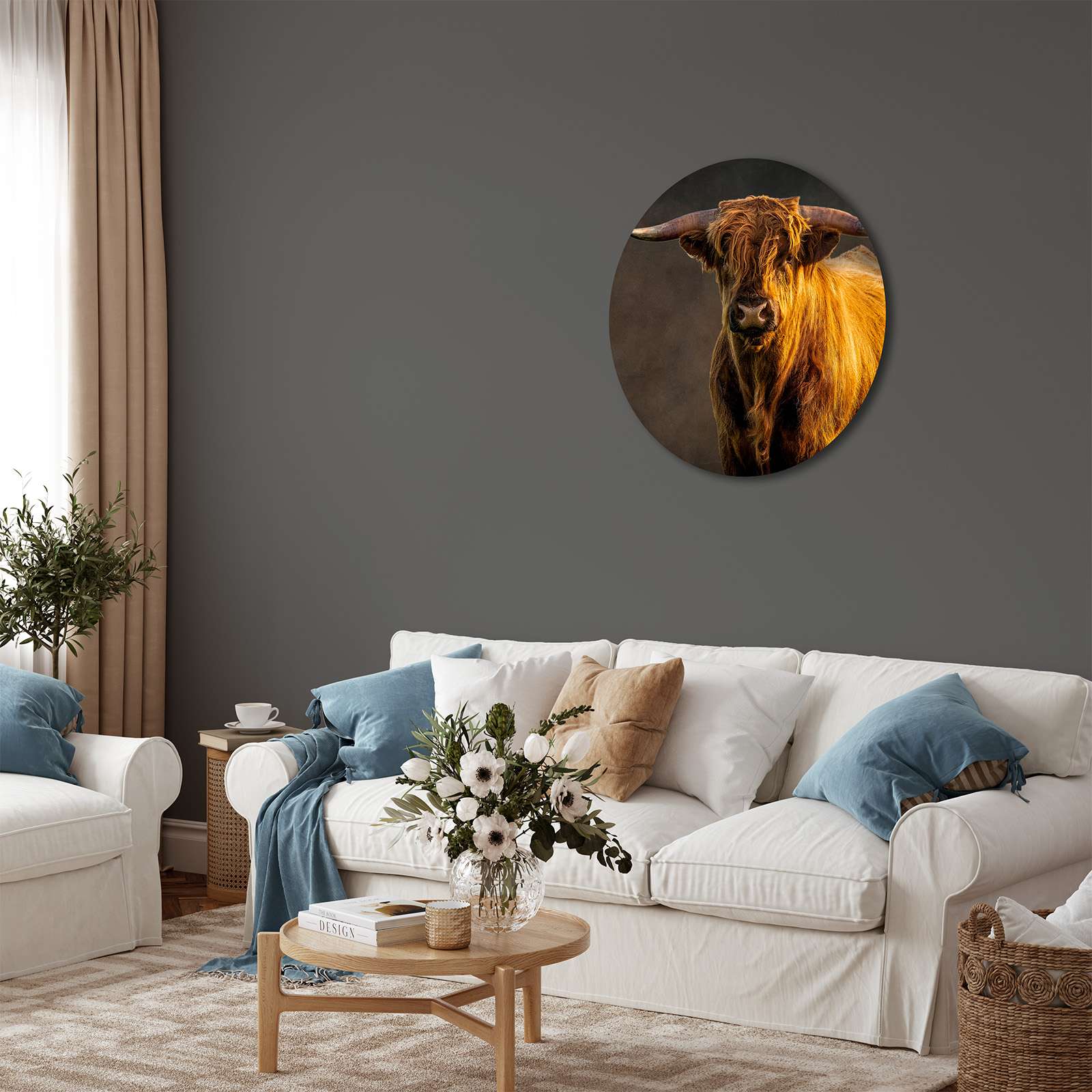 Op zoek naar een prachtige wandcircel Schotse Hooglander voor aan de muur? Dan is onze muurcircel “Goldy” de juiste keuze! Voeg een unieke blikvanger toe aan je interieur met deze wandcircel Schotse Hooglander Goldy. Deze prachtige wandcirkel toont een imposante Schotse Hooglander, waarvan de vacht oplicht in een gouden gloed door de ondergaande zon. Het ronde ontwerp en de warme kleuren creëren een rustgevende en betoverende sfeer in je woonkamer, slaapkamer of kantoor.